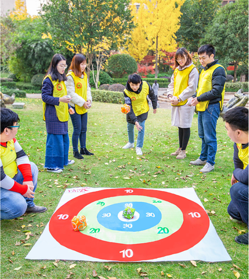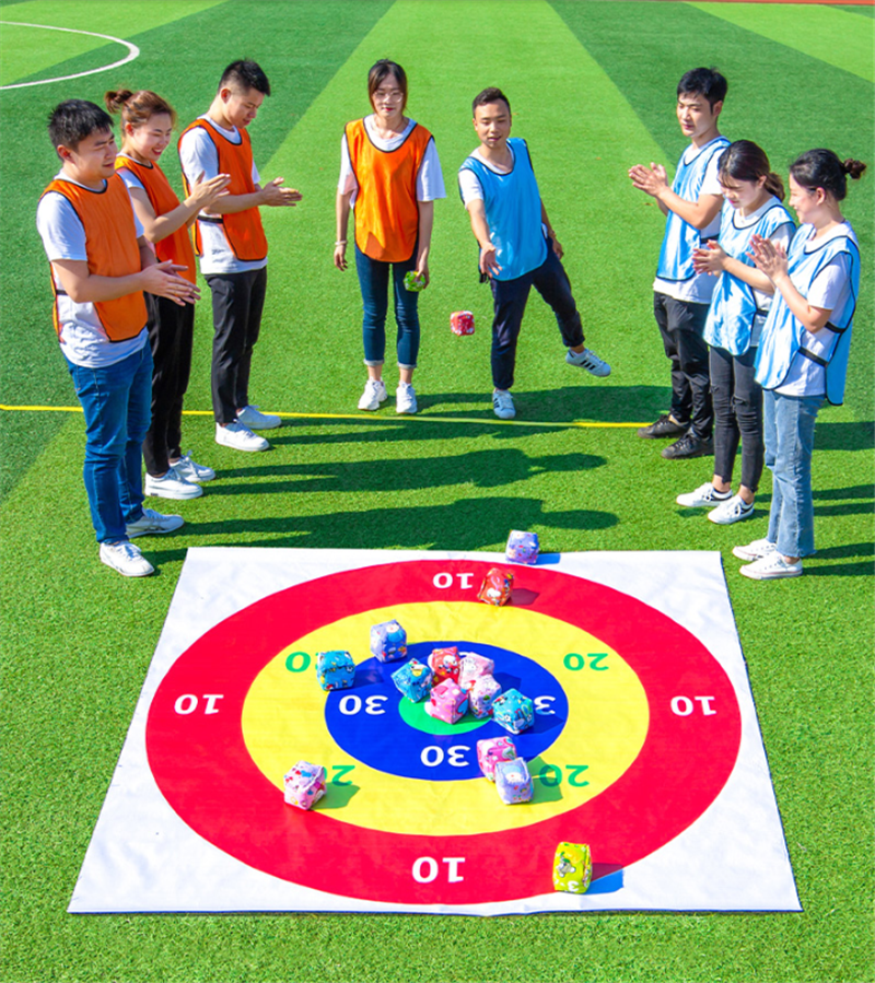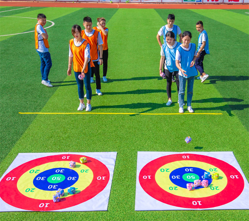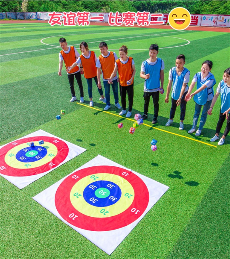 沙包掷准【参赛人数】每组4人【比赛方法】4人依次投掷沙包,每人有五次机会,所有队员得分累计相加,根据总分进行排名。