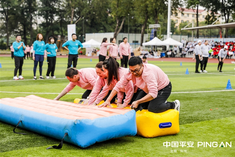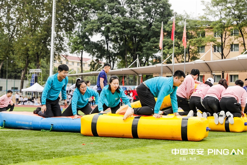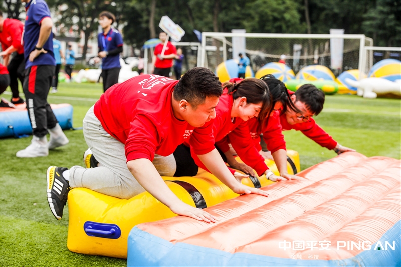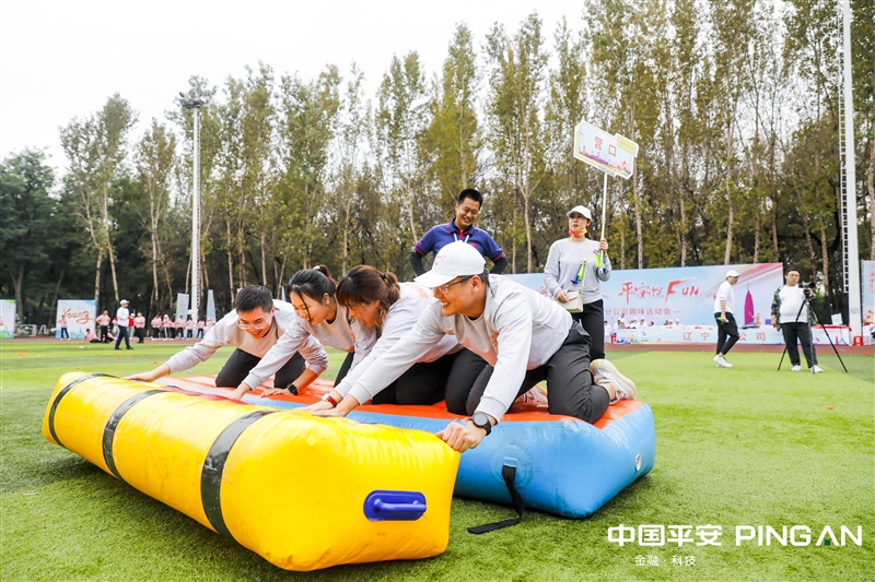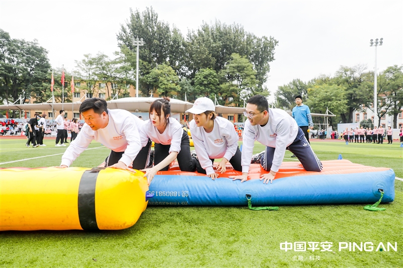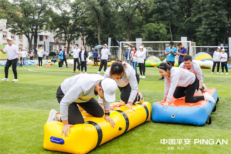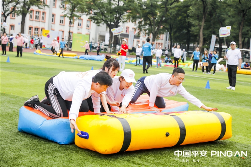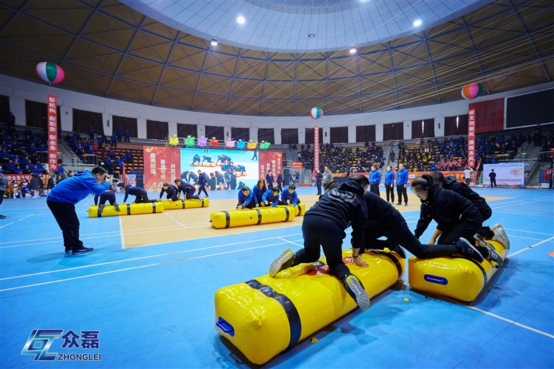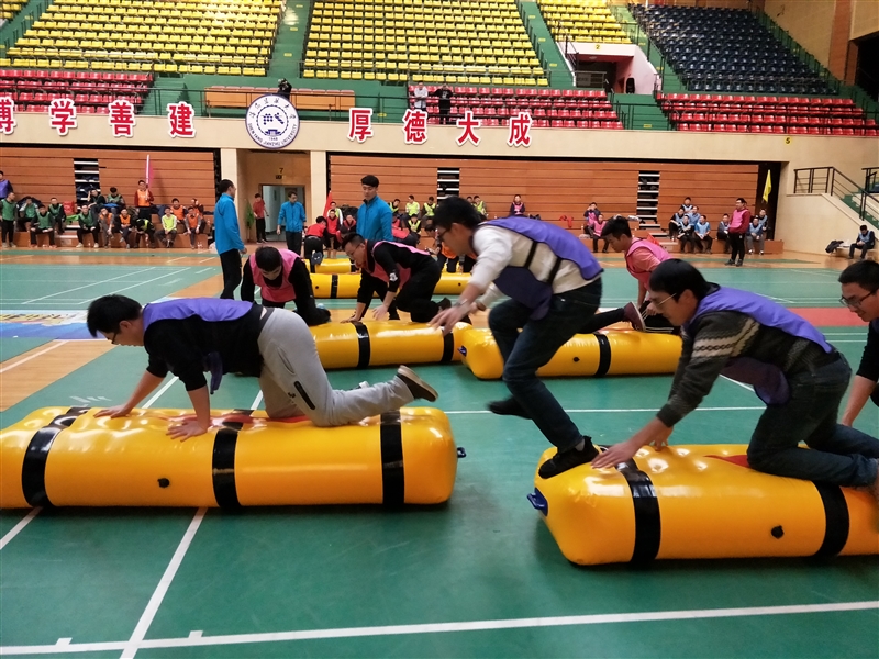 同舟共济【参赛人数】每组8人【比赛方法】4人一小组,分别为A组和B组,A组从起点出发,B组在接力点等待。队员需要在充气道具上使道具交替前进,用时最短的队伍获胜。