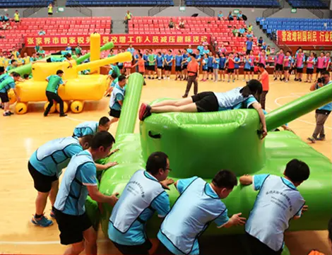 罗马战车【参赛人数】每队20人【比赛方法】在战车上面对面坐着,其他队员通过调整充气垫子和充气原木让战车前进,到达终点后交给终点处的十名队员再返回起点,用时最短的队伍获胜。